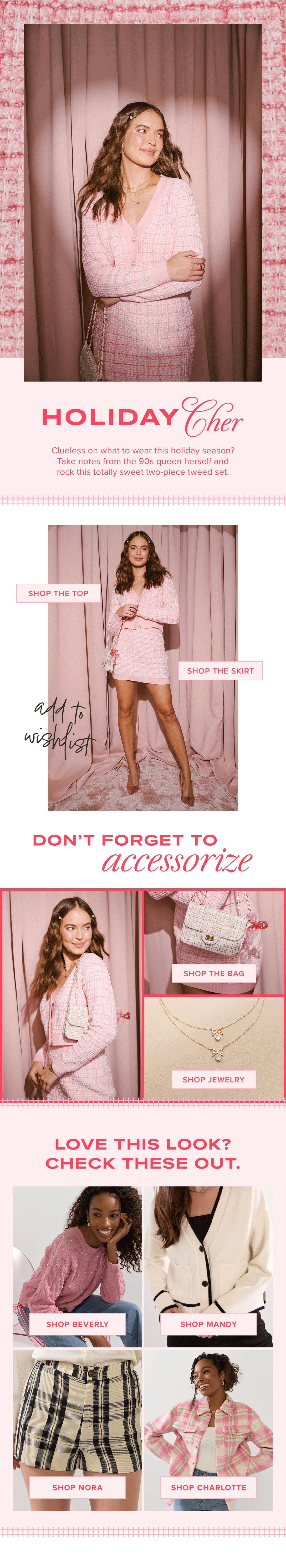 Tweed is an evergreen cool-weather trend—but this set wasn’t sticking around for long. After selling out once, the December restock called for high-energy creative to match the hype. The larger collection carried a Valentine’s-inspired visual identity—an unexpected pairing with the holiday season—that merged Francesca’s evergreen palette with a bright red, creating the prettiest blend of Valentine’s romance and holiday cheer.