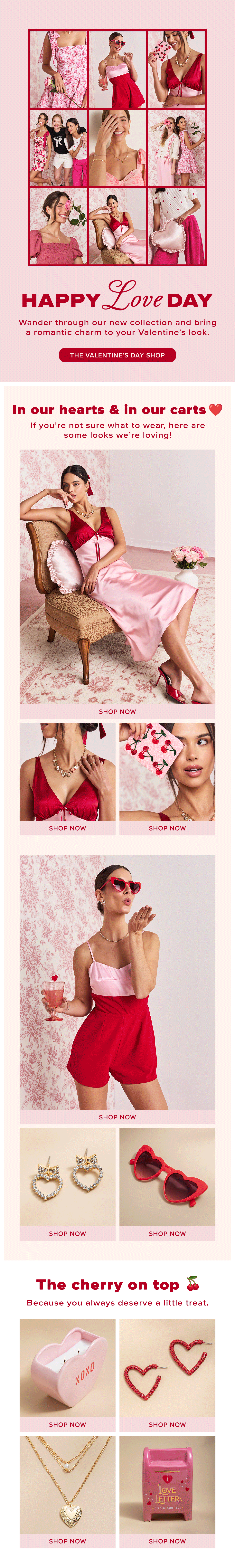 Although this Valentine’s Day send went out in February—during the launch of a completely different collection—it spotlighted remaining pieces from December’s Valentine’s-inspired line, defined by its mix of Fran’s signature pinks and bold reds, hearts, lace, and feminine frills.